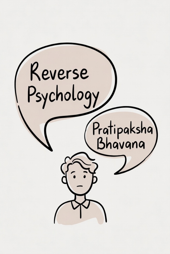 “Reverse psychology uses opposition to influence behavior, whereas Pratipakṣa Bhāvana uses conscious ethical counter-cultivation to purify mental tendencies. One manipulates reaction; the other transforms samskāra.”